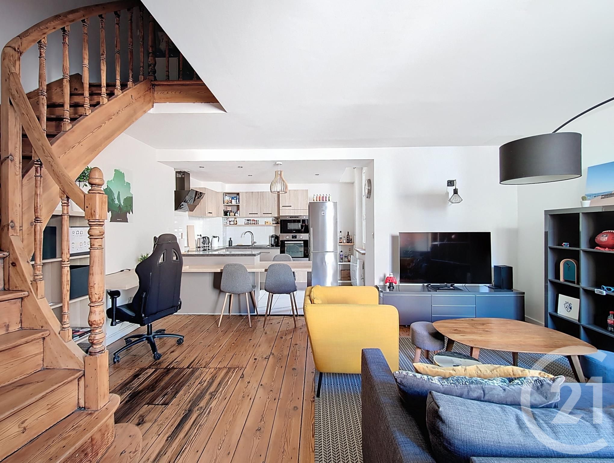 Au dernier étage d'une copropriété en pierre, l'entrée dessert un bel espace de vie avec séjour, cuisine ouverte entièrement aménagée et équipée et WC.