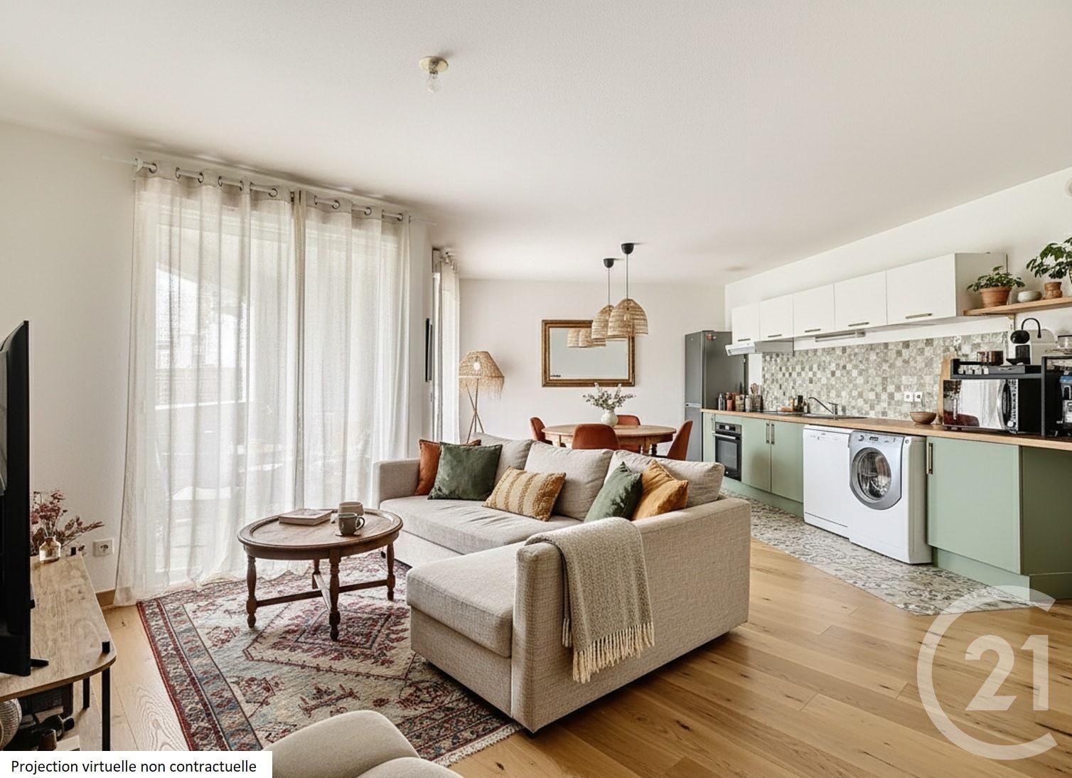 L'appartement 3 pièces de 65m², comprend une entrée spacieuse, un séjour-cuisine ouvert de 27,55 m², parfait pour recevoir.